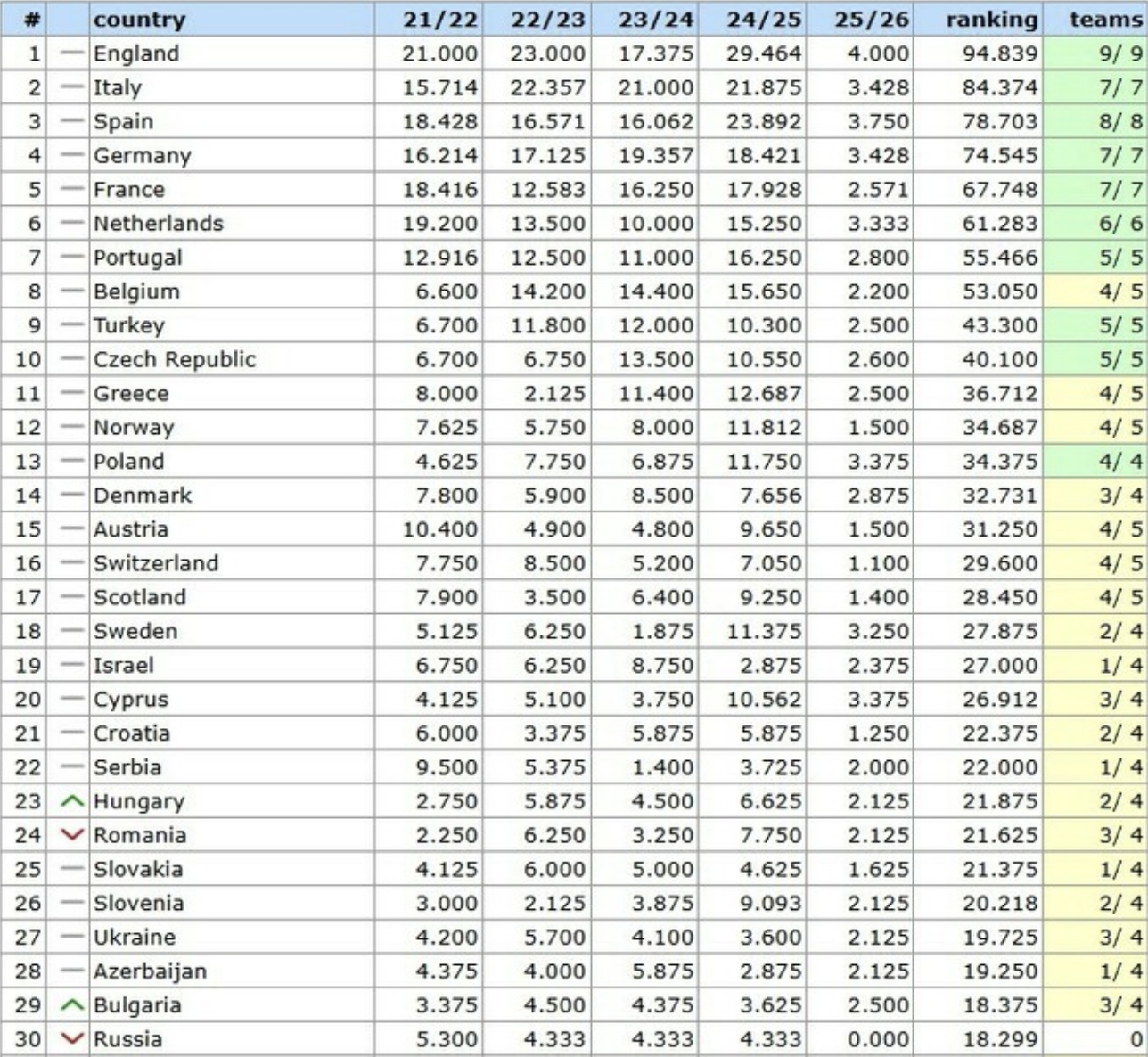 Таблица коэффициентов УЕФА получила изменения после ответных матчей третьего раунда квалификации (Q3) еврокубков.