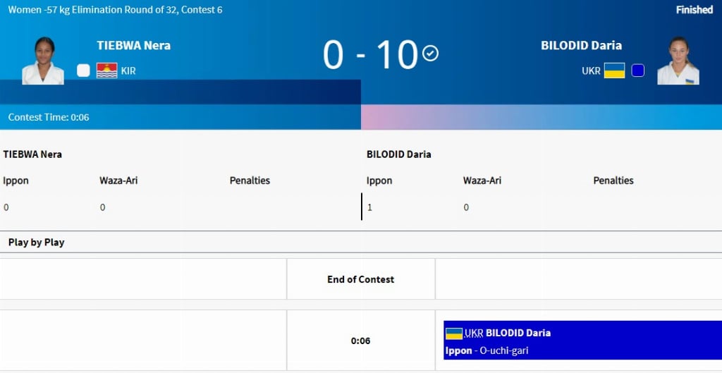 Українка, яка виступає у ваговій категорії до 57 кг, в 1/16 іпоном перемогла Неру Тібва з Кірібаті. Сутичка тривала 6 секунд.