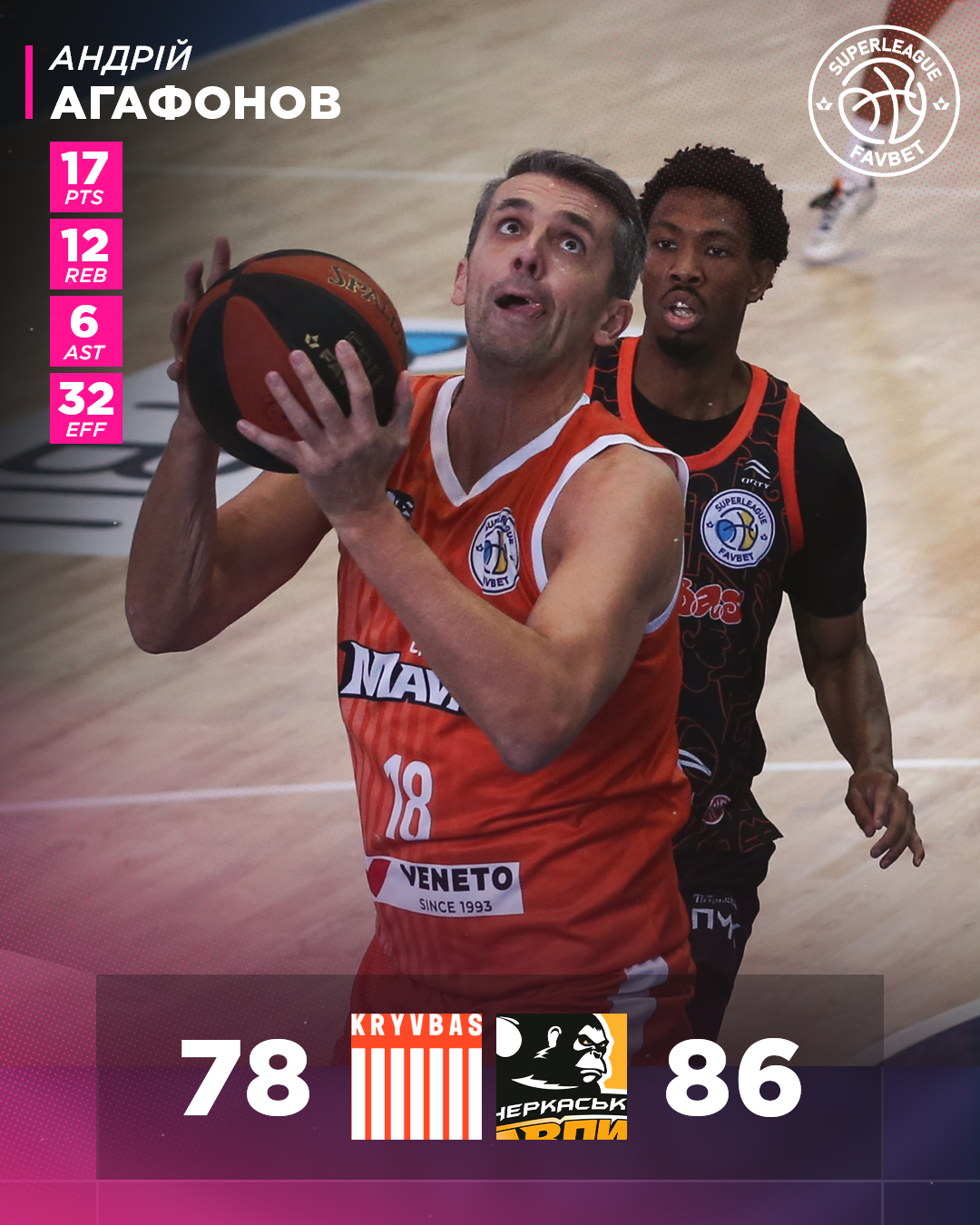 Кривбас: Бібіков 14, Хілл 25 + 5 підбирань + 6 передач, Пікок 10 + 3 передачі + 3 перехоплення, Водолазський 8 + 5 підбирань, Скіра 11 + 6 підбирань — старт; Триколенко 4, Коротченко 3, Бречка 3, Пашолок 0, Мельник 0.