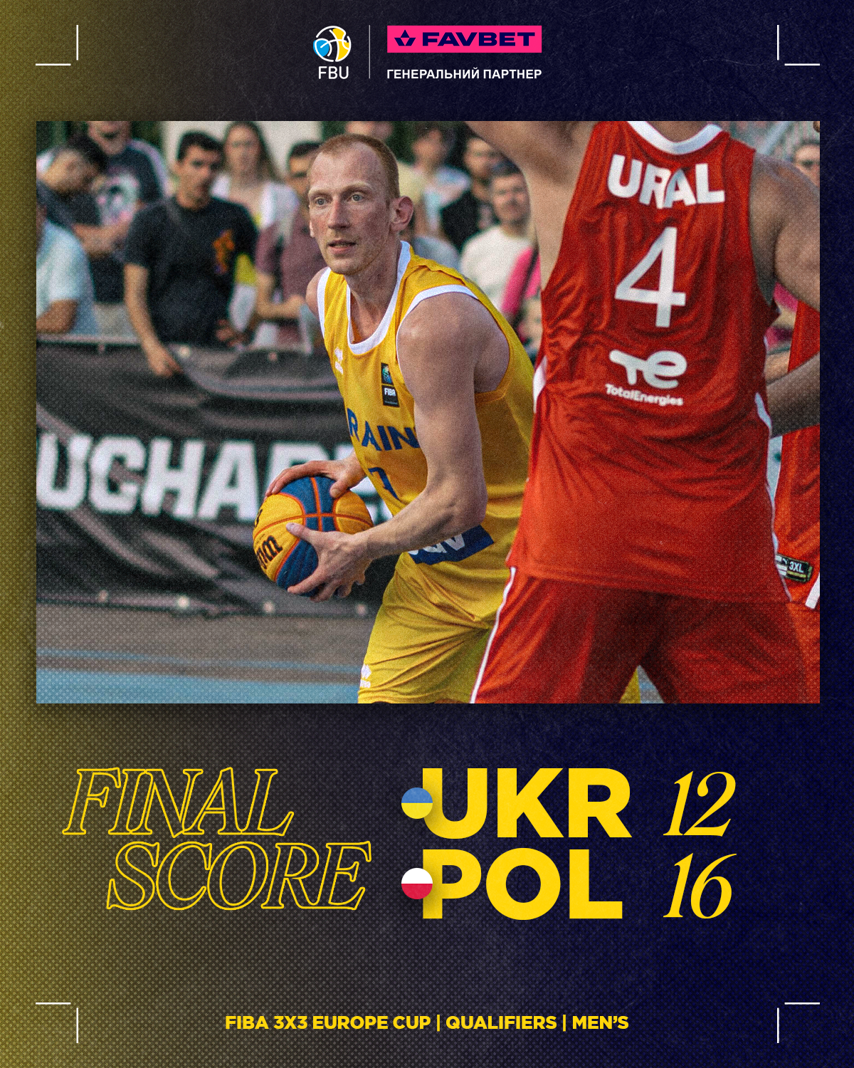 Чоловіча збірна України 3х3 зазнала поразки в матчі 1/4 фіналу кваліфікації чемпіонату Європи, поступившись команді Польщі — 12:16. Суперник зміг перехопити ініціативу в другій половині матчу та довести гру до перемоги.