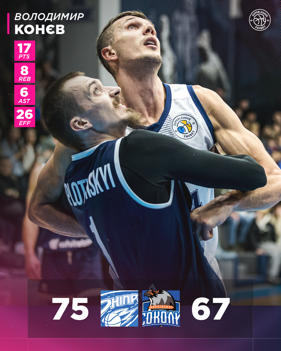 Дніпро здобув домашню перемогу в центральному матчі шостого туру регулярного чемпіонату Суперліги Favbet, здолавши на домашньому майданчику Харківських Соколів — 75:67.
