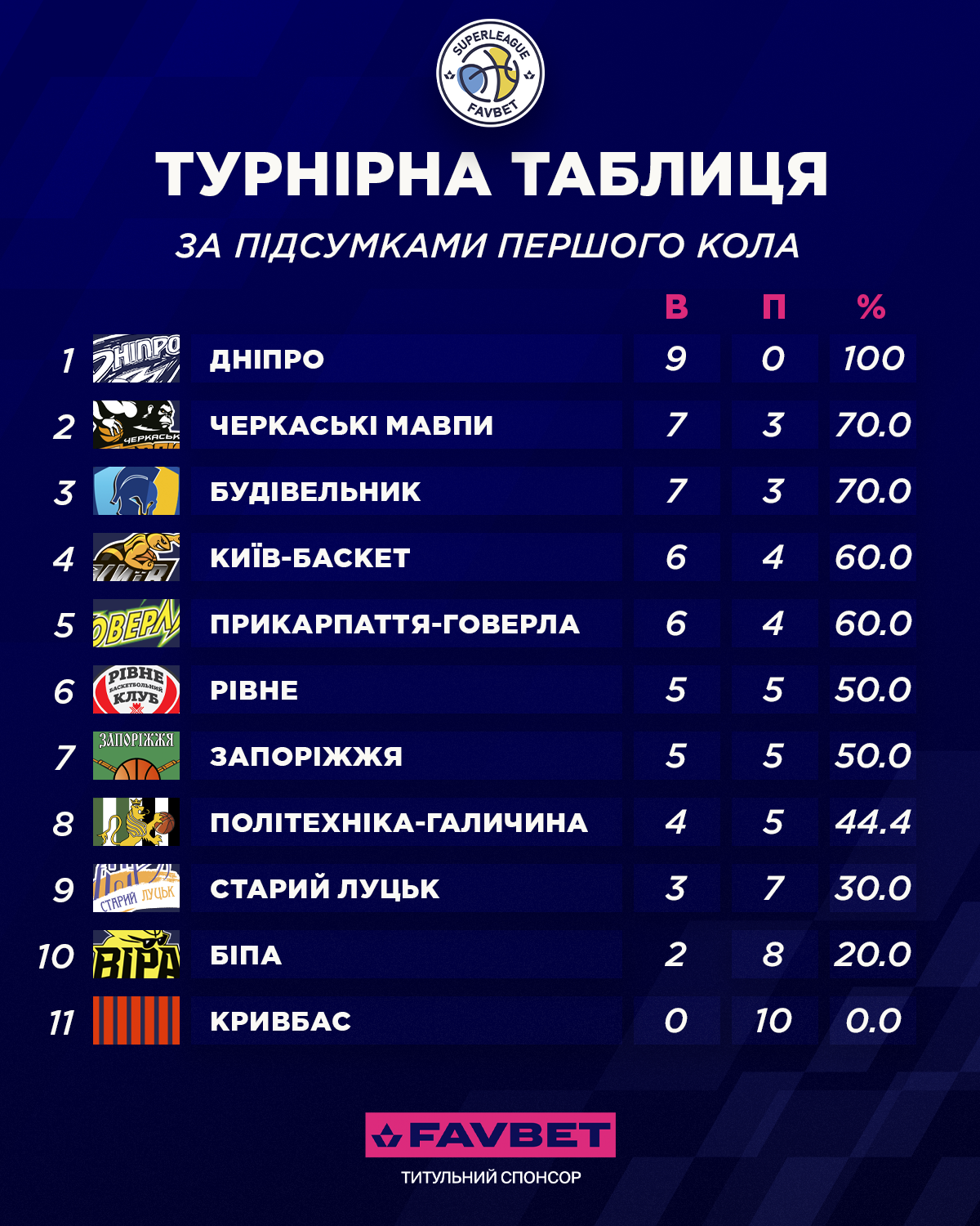 В регулярному чемпіонаті Суперліги Favbet завершилось перше коло. Всі команди зіграли по 10 матчів за виключенням Дніпра та Політехніки-Галичини – вони не встигли дограти свій матч через повітряні тривоги.