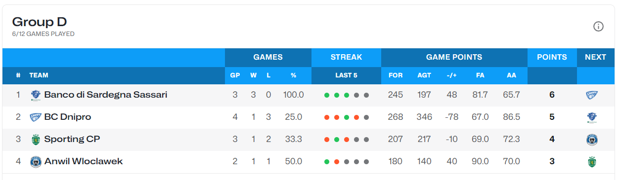 Наразі у команди Володимира Коваля одна перемога в чотирьох матчах, тоді як Динамо Сассарі виграло всі свої три гри. До наступного кола виходять лише переможці груп та шість кращих команд, що займуть друге місце.