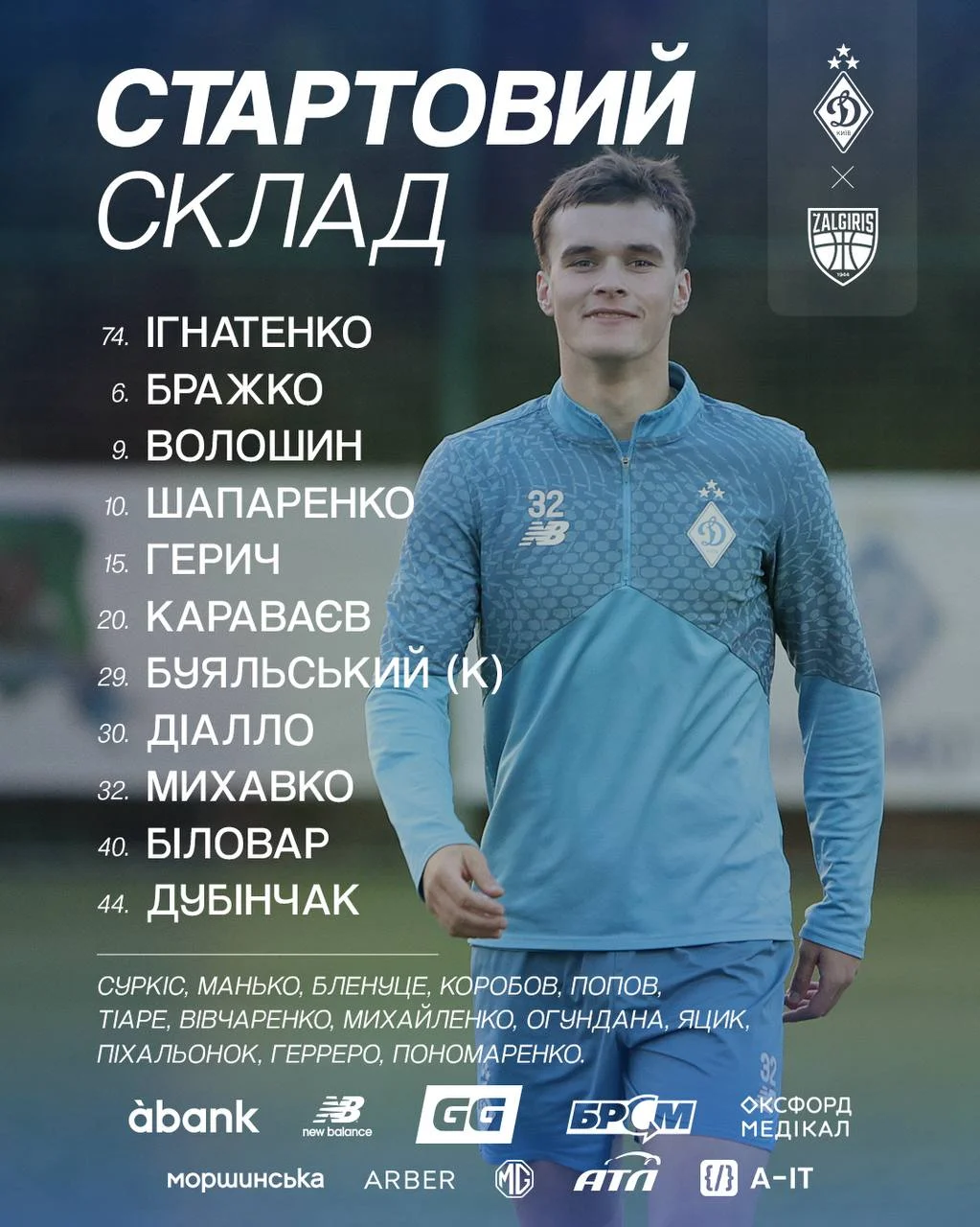 Стартовий склад Динамо: Ігнатенко, Бражко, Волошин, Шапаренко, Герич, Караваєв, Буяльський (к), Діалло, Михавко, Біловар, Дубінчак.