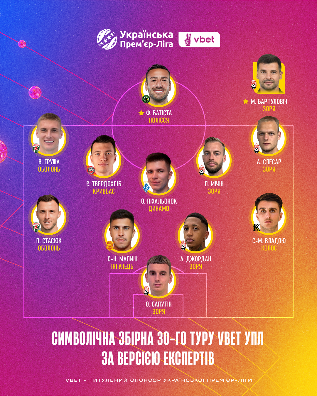 Українська Прем’єр-Ліга продовжує відзначати героїв сезону 2024/25 і склала символічну збірну 30-го туру Чемпіонату УПЛ, а також назвала найкращого гравця та найкращого тренера 30-го туру. Традиційно це було зроблено разом з ведучими, експертами, коментаторами УПЛ ТБ та представниками провідних спортивних ЗМІ України. Цього разу їх було 35.