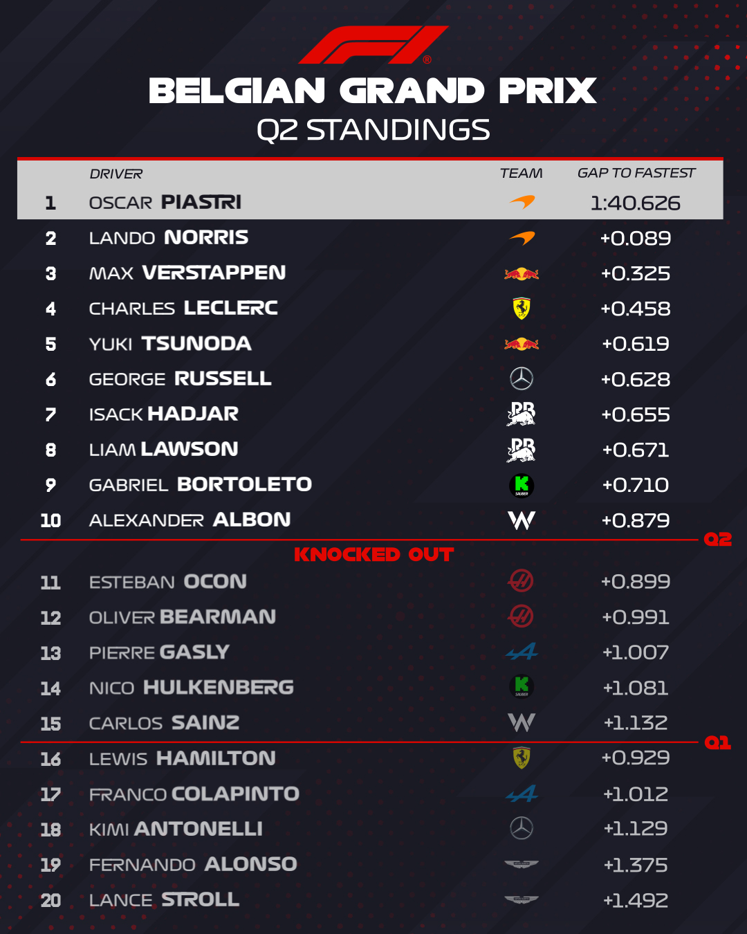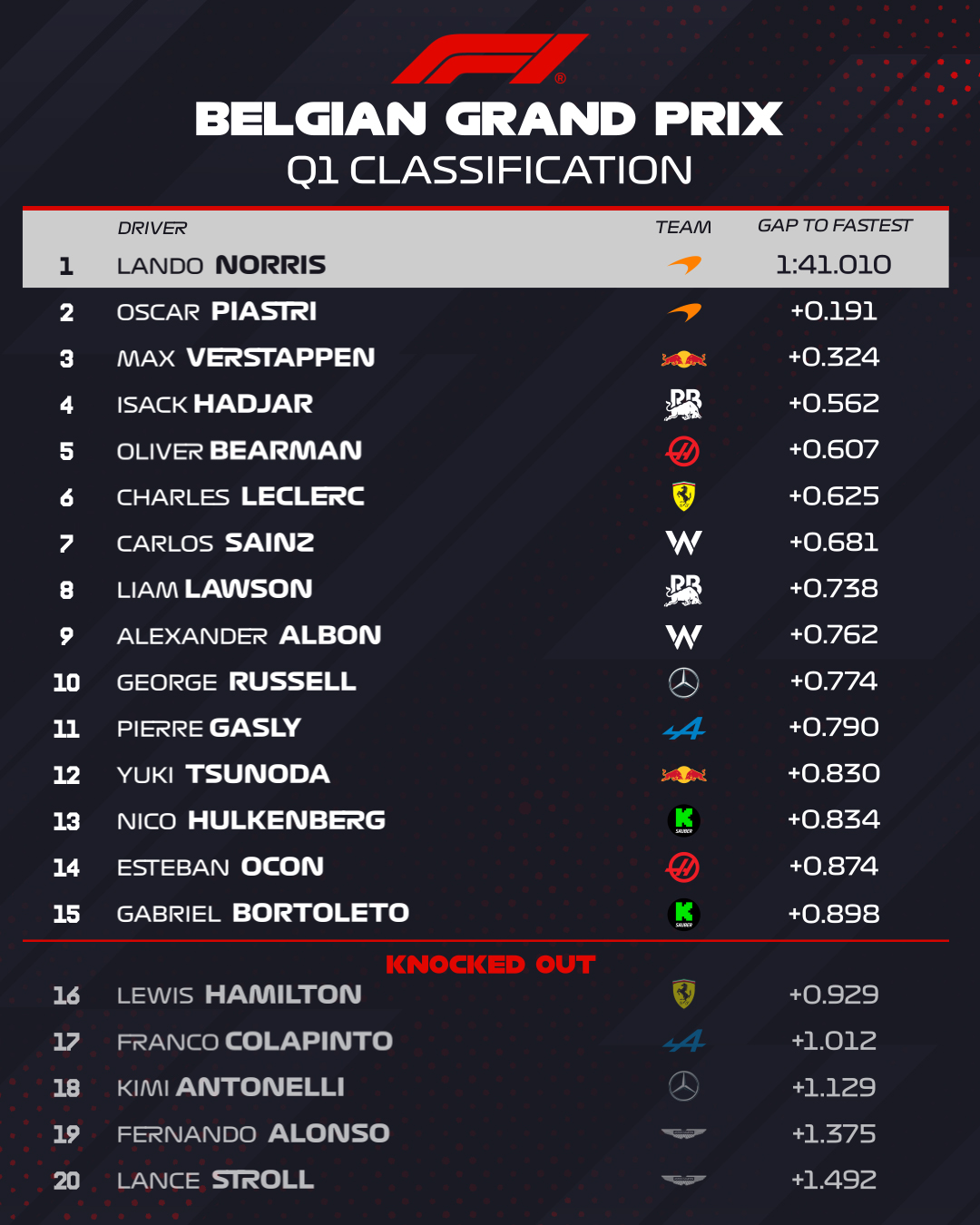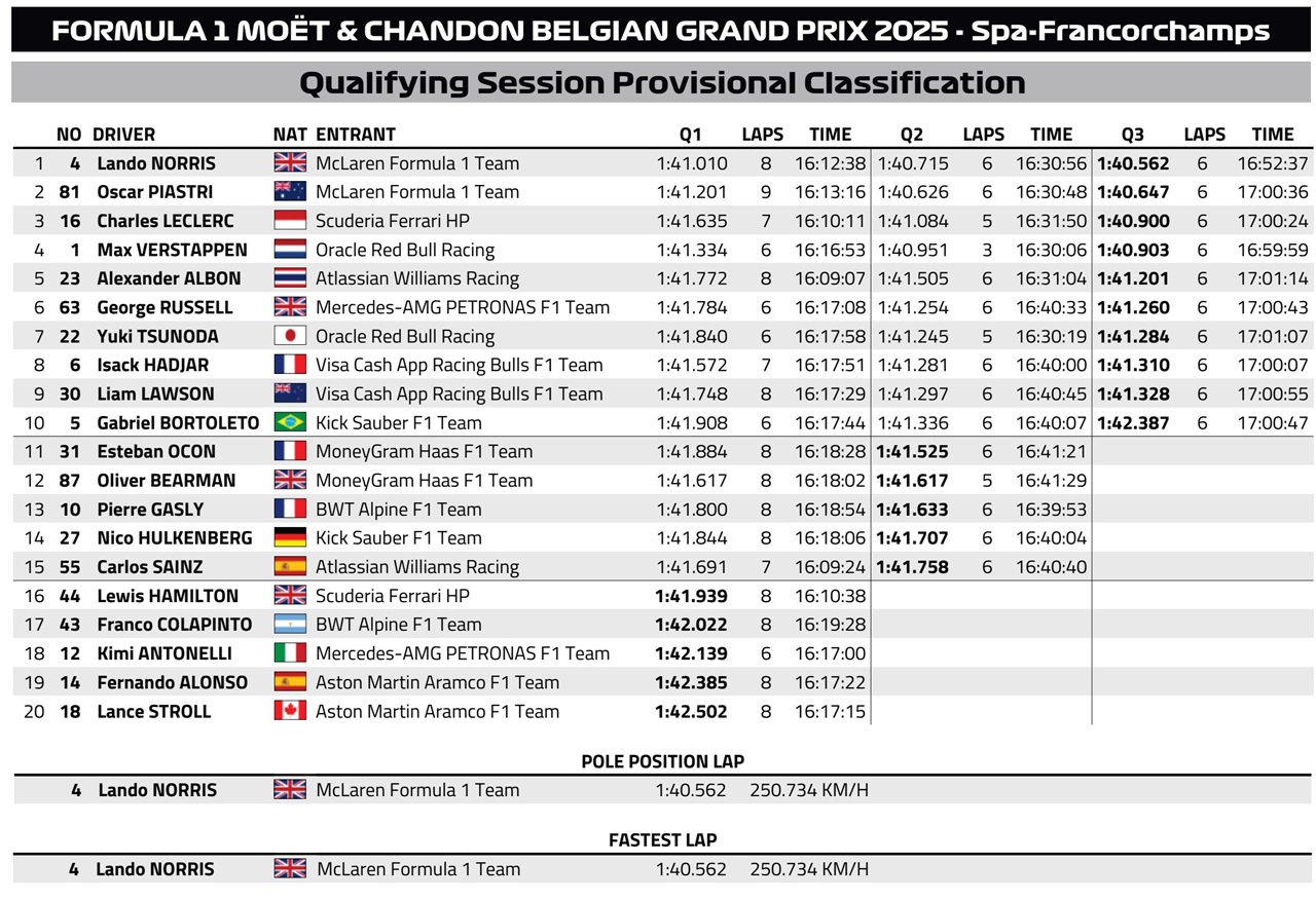 Таким чином, проміжний поул Норріса перетворився на його четвертий поул у сезоні та вже 13-й у кар’єрі. Перший стартовий ряд залишився за McLaren, а на другому розташувались Леклер та Ферстаппен.