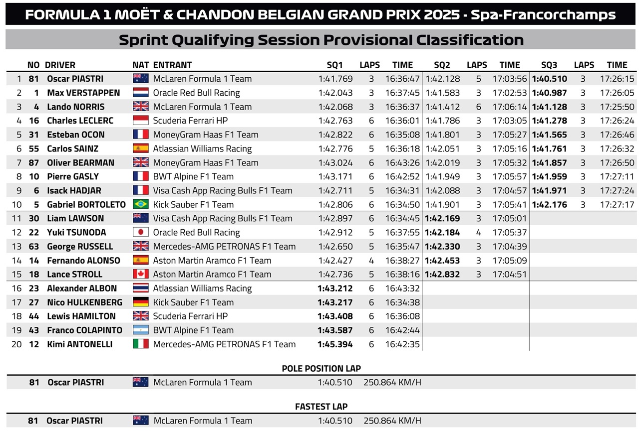 Гонщик McLaren Оскар Піастрі став найкращим у кваліфікації до суботньої спринтерської гонки в рамках Гран Прі Бельгії.