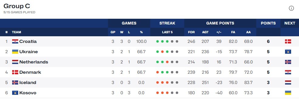 Такі результати дозволяють збірній України бути другою в групі – у Данії, Нідерландів та України по 2 перемоги в трьох іграх, але за додатковими параметрами вище саме наша збірна.