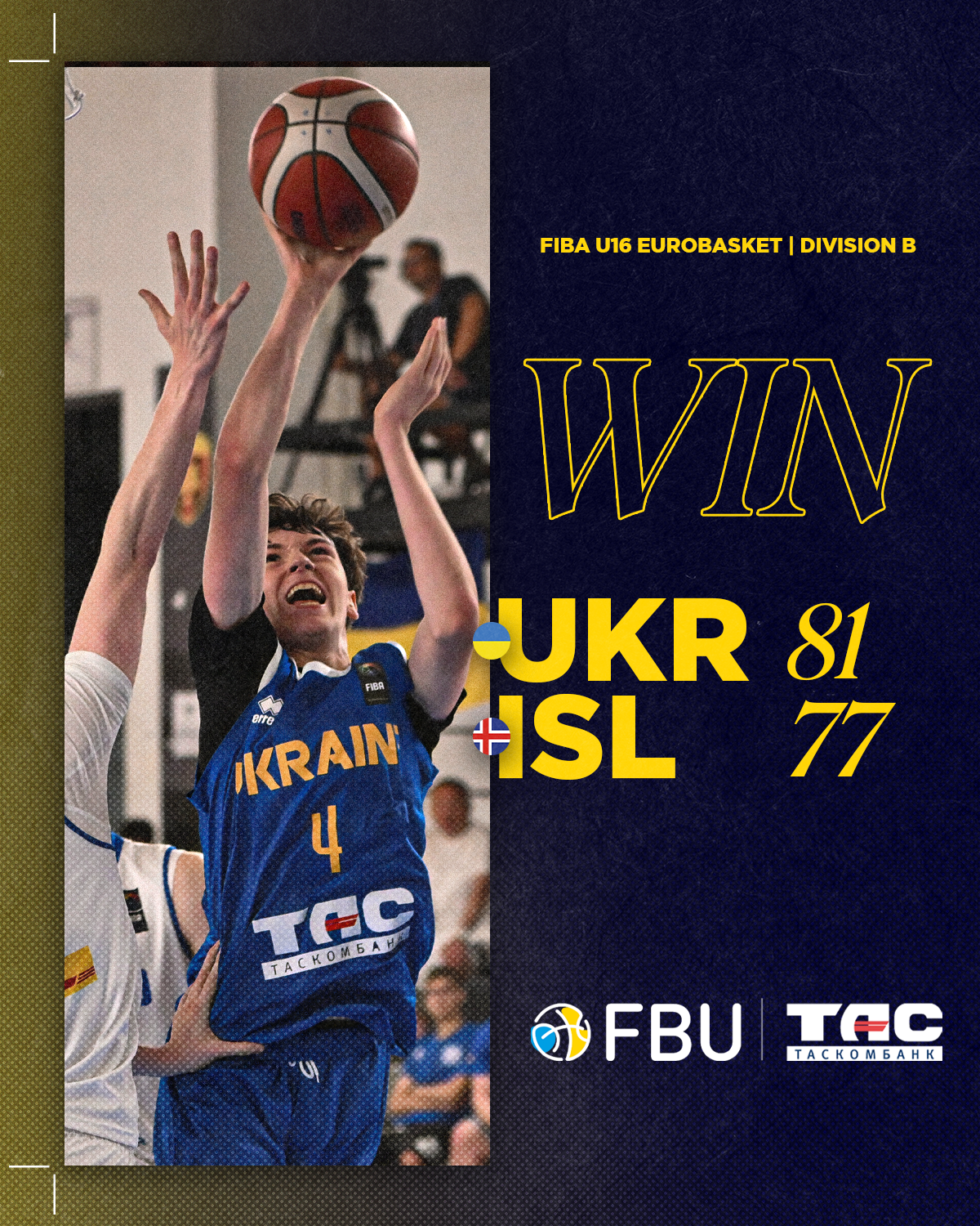 Чоловіча кадетська збірна України U-16 здобула свою другу перемогу на чемпіонаті Європи у Дивізіоні В, обігравши Ісландію з рахунком 81:77.