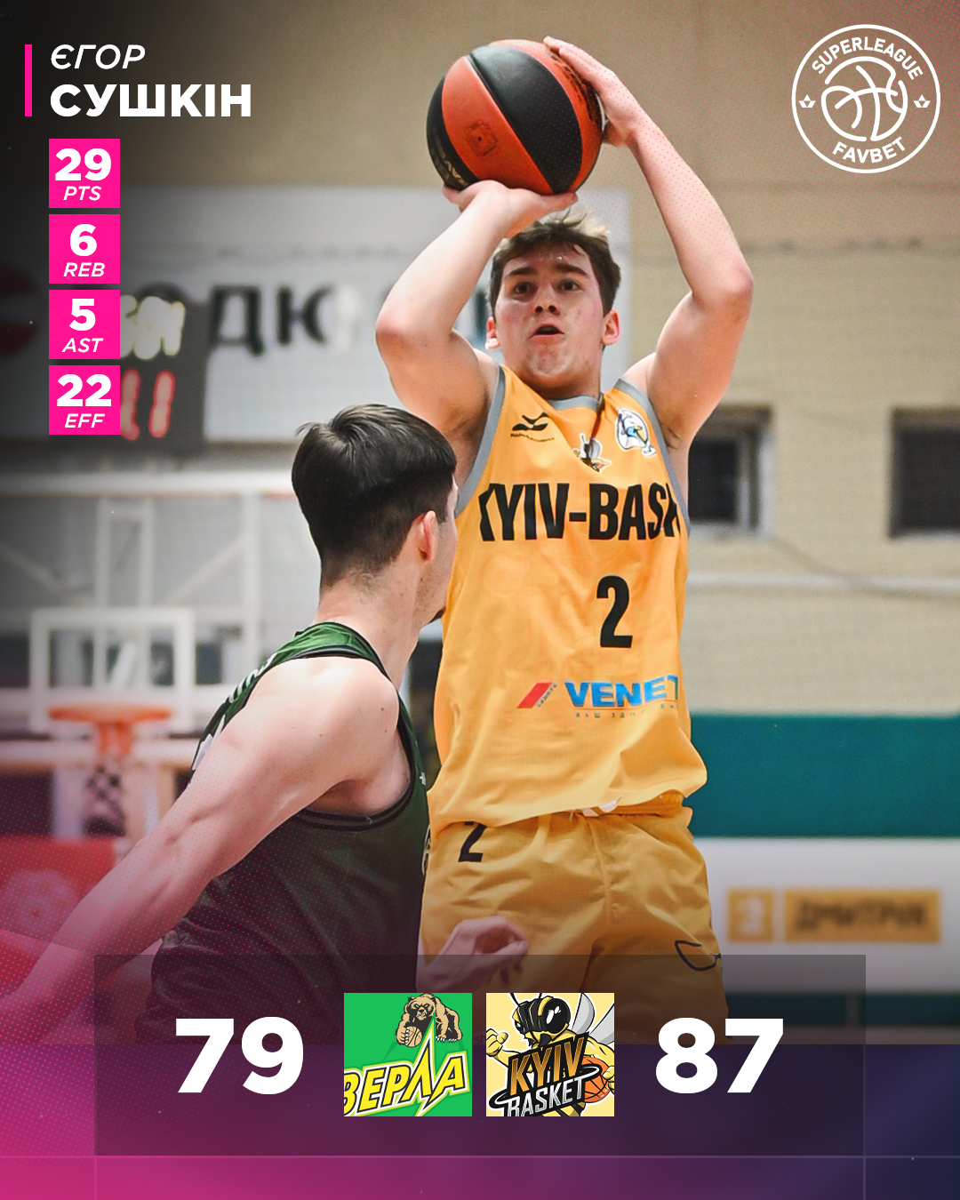 Київ-Баскет: Бублик 2, Сушкін 29 + 6 підбирань + 5 передач, Смітюх 4, Клевзуник 13 + 7 підбирань, Сандул 13 + 10 підбирань – старт; Карпюк 9 + 9 підбирань, Колаволе 8, Романиця 7, Мочалов 2, Маліч 0, Рижков 0