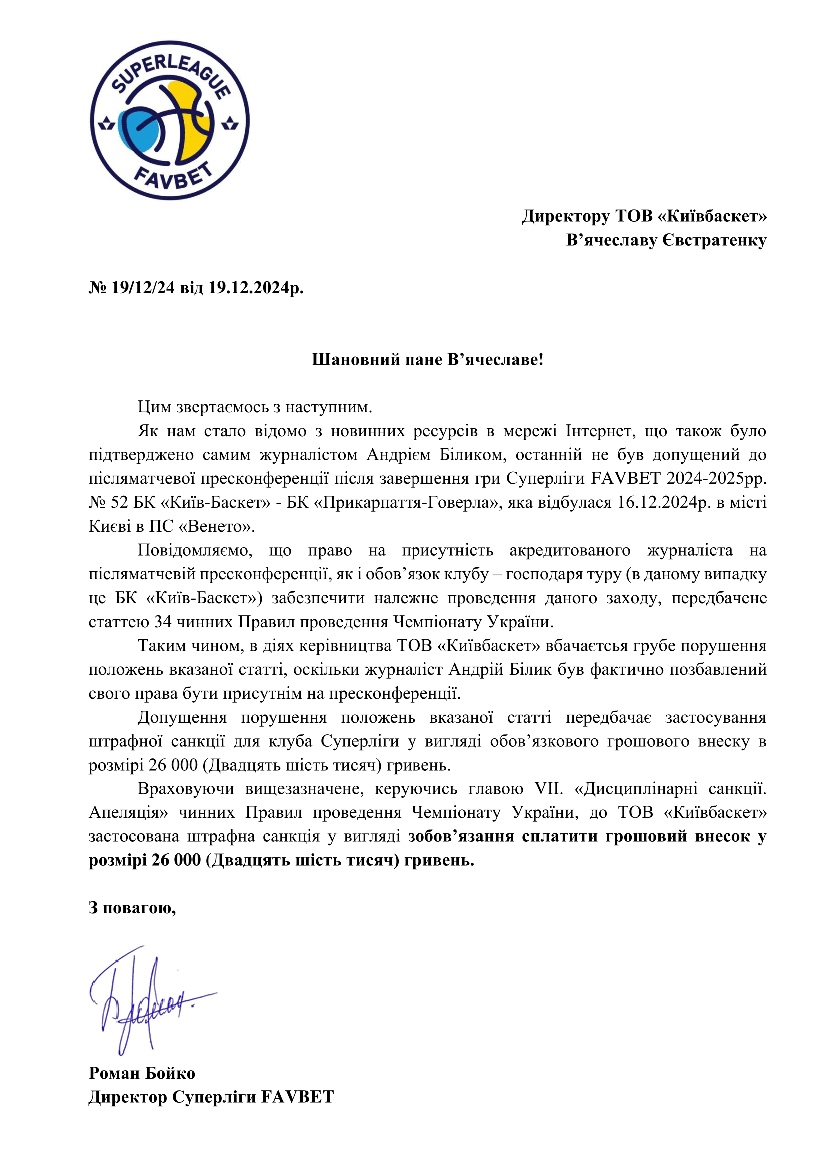 Таким чином, Київ-Баскет порушив положення вказаної статті, оскільки журналіст Андрій Білик був фактично позбавлений свого права бути присутнім на пресконференції.