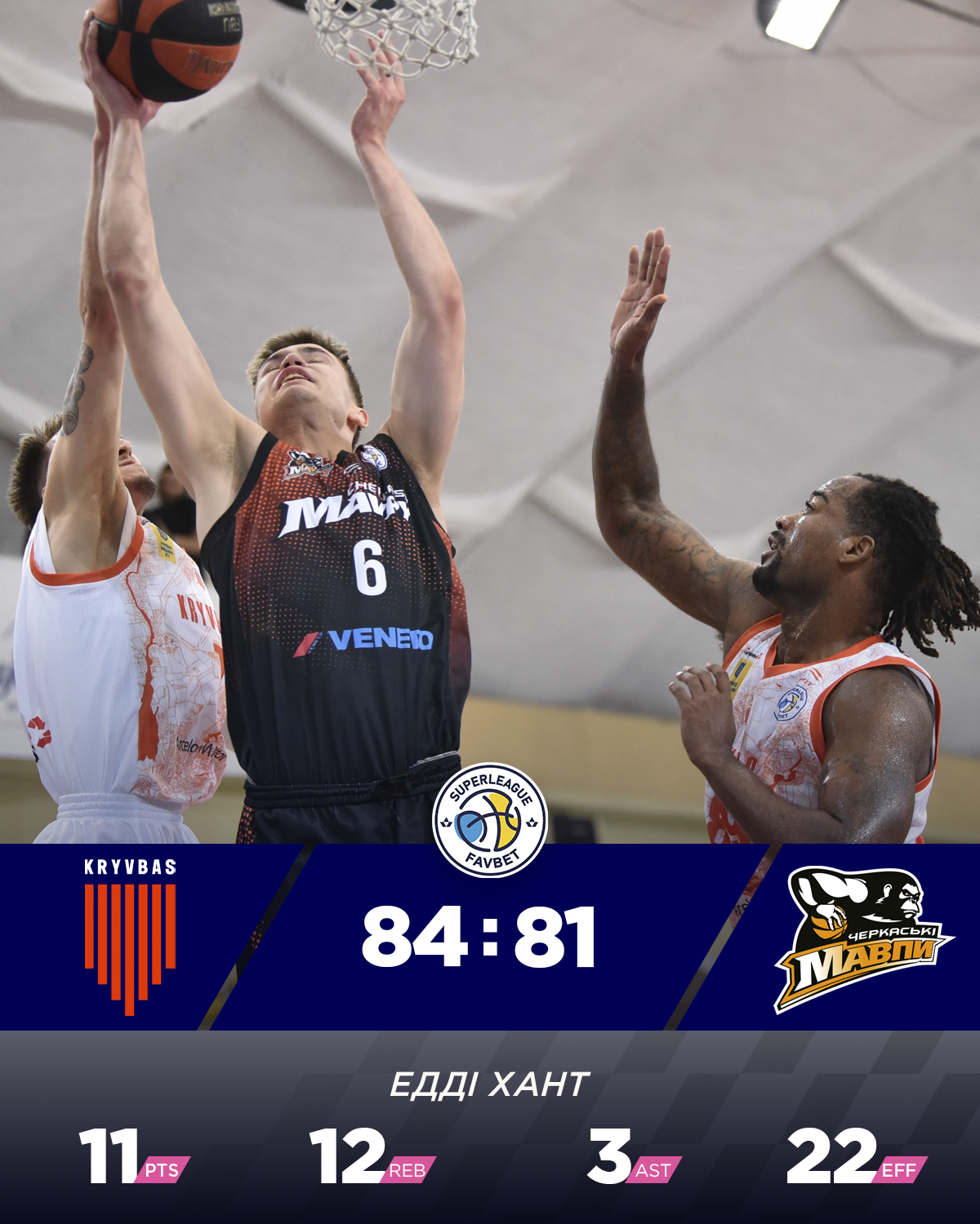 Кривбас здобув перемогу в матчі регулярного чемпіонату Суперліги Favbet, здолавши в Черкасах місцевих Мавп. Команда Олександра Ворони виграла з рахунком 84:81.