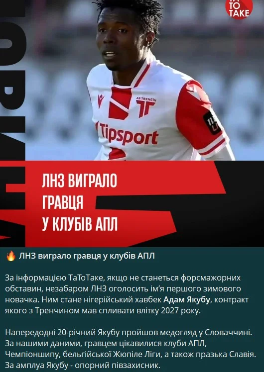 Якщо не станеться ніяких форс-мажорних обставин, уже незабаром ЛНЗ зможе оголосити про підписання нігерійського опорника Адама Якубу, повідомляє ТаТоТаке. Потенційну суму трансферу не називають.