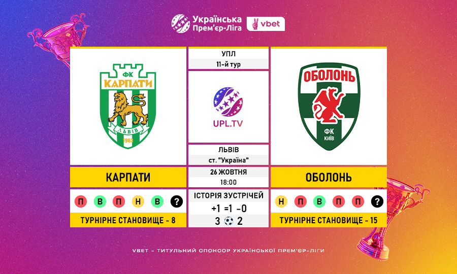 Матч 11-го туру VBET Української Прем’єр-Ліги «Карпати» — «Оболонь»: статистичне прев’ю