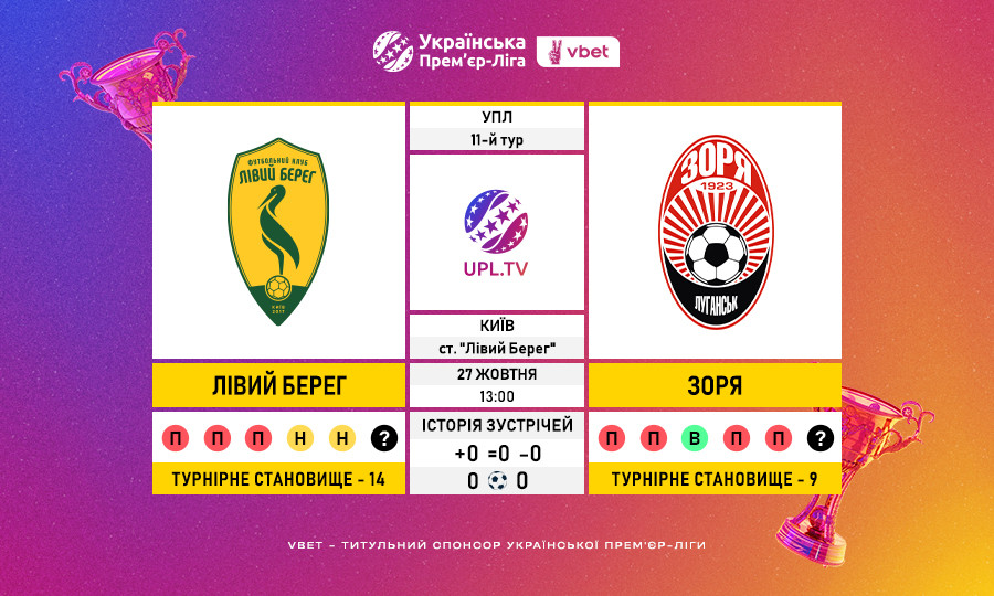 Матч 11-го туру VBET Української Прем’єр-Ліги «Лівий Берег» — «Зоря»: статистичне прев’ю