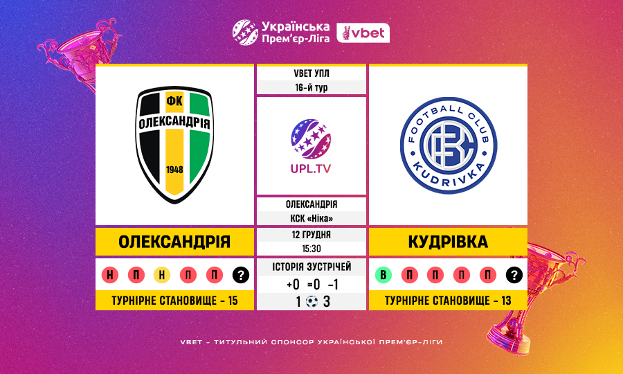 Матч 16-го туру VBET Української Прем’єр-Ліги «Олександрія» — «Кудрівка»: статистичне прев’ю