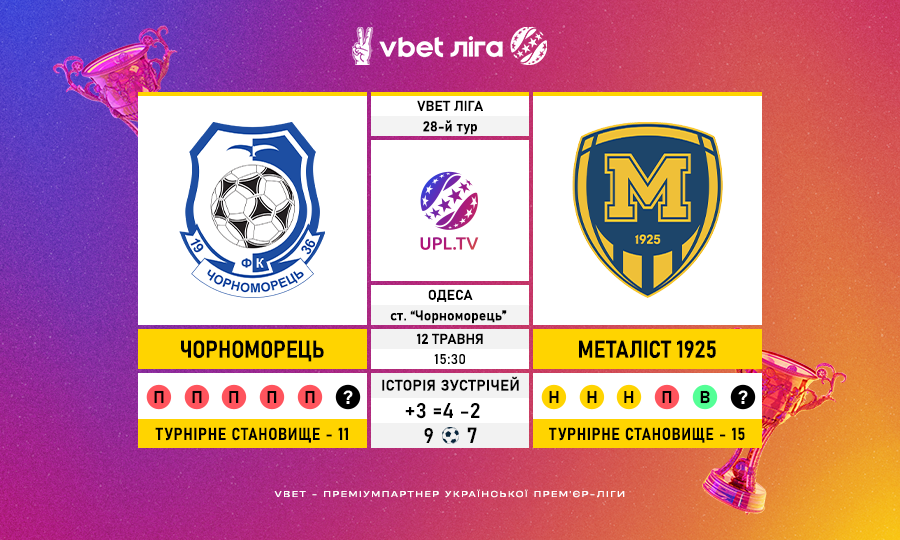 Матч 28-го туру VBET Ліги «Чорноморець» — «Металіст 1925»: статистичне прев’ю