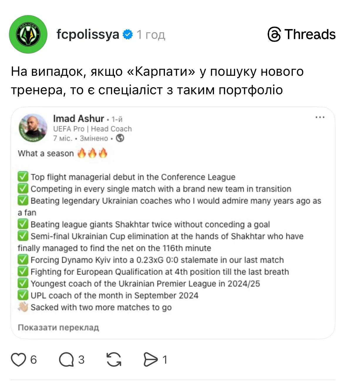 Поки офіційних заяв від львів’ян немає, прес-служба житомирців знову відзначилася зухвалим креативом. У Threads «вовки» опублікували старий пост Імада Ашура, у якому тренер підбивав підсумки після завершення роботи в Поліссі. Публікацію супроводили іронічним підписом: «На випадок, якщо Карпати у пошуку тренера, то є спеціаліст з таким портфоліо».