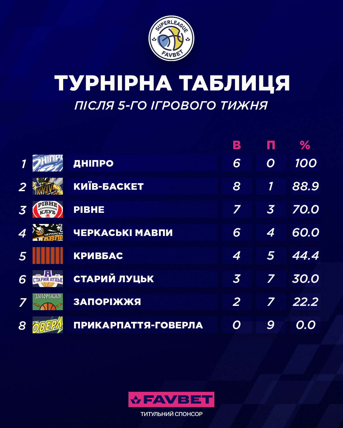 Суперліга Favbet: турнірна таблиця після п’яти ігрових тижнів — Федерація баскетболу України