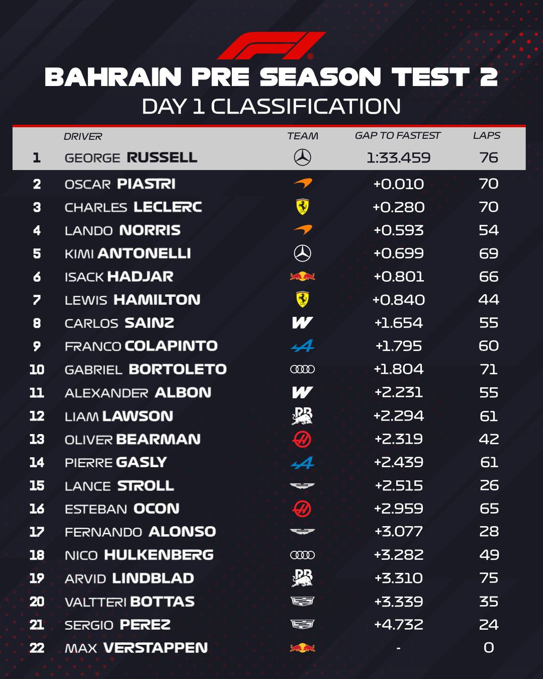 Ландо Норріс та Антонеллі увійшли до п’ятірки лідерів, а Ісак Аджар з Red Bull – єдиний пілот, який завершив весь день – посів шосте місце. Аджар встановив особистий рекорд у 1 хв 34,260 с та подолав незначні – за сучасними стандартами – 66 кіл після того, як його ранкова активність була обмежена 13 колами через технічну проблему, пов’язану з контурами охолодження двигуна.