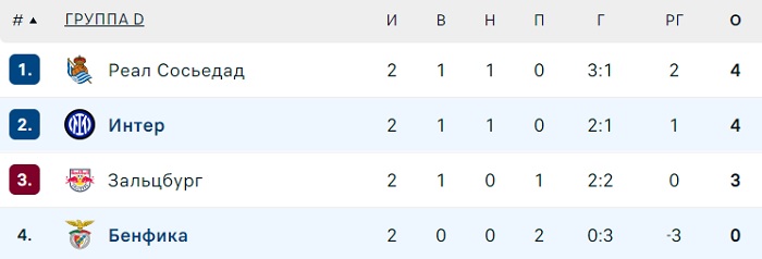 «Интер» пропустил вперед «Реал Сосьедад» с лучшей статистикой в группе D. У обеих команд по 4 очка в копилке. У «РБ Зальцбург» 3 балла и 3-е место, а «Бенфика» с 0 последняя.