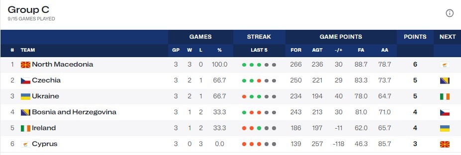 Чехія займає другу сходинку – після перемоги над Україною, чехи обіграли Ірландію 71:56 і поступились Північній Македонії. У боснійців та ірландців лише одна перемога, а Кіпр залишається без перемог в нашій групі.