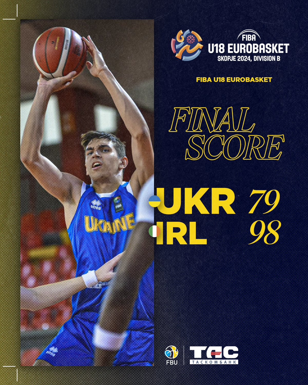 Юнацька збірна України U-18 поступилась Ірландії з рахунком 79:98 в матчі групового турніру чемпіонату Європи у Дивізіоні В.