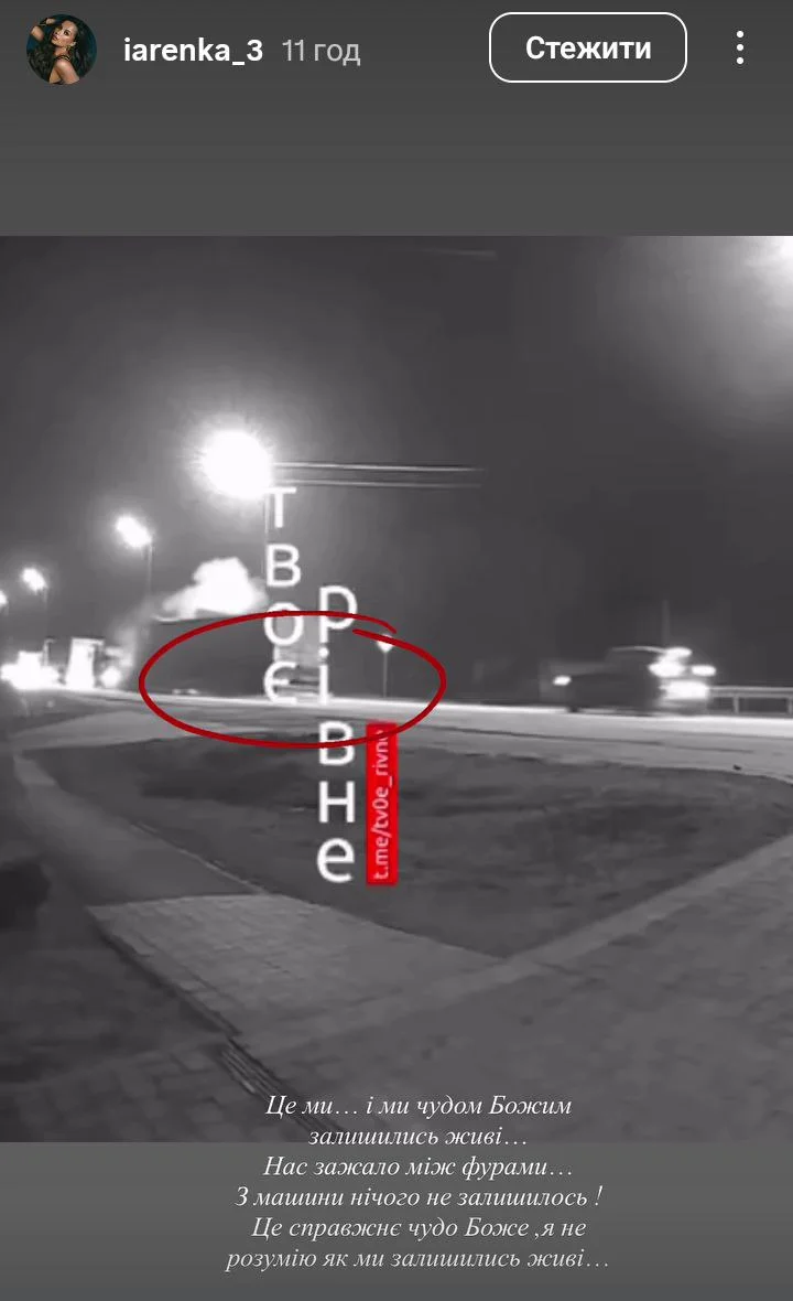 «Це ми… І ми чудом Божим залишились живі… Нас затиснуло між фурами… Від машини нічого не залишилось! Це справжнє чудо боже, я не розумію, як ми залишились живі…», – написала вона.
