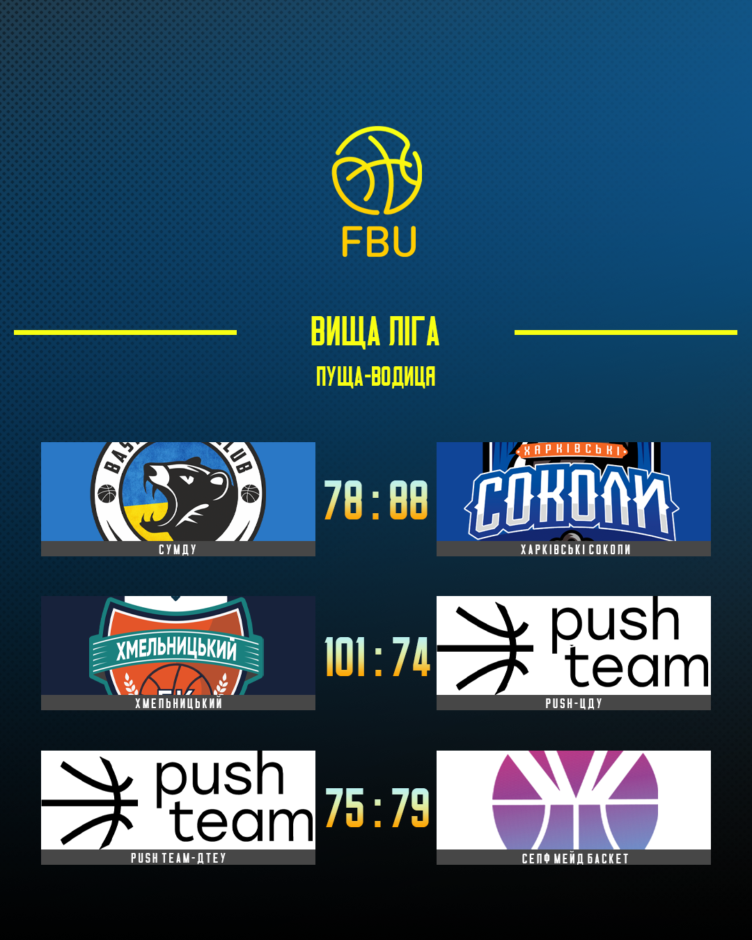 Ще в одному матчі дня Хмельницький обіграв Push-ЦДУ 101:74. Вiталiй Володiн в цьому матчі приніс Хмельницькому 20 очок та зібрав 9 підбирань. У лідера команди з Кропивницького Романа Потєєва 33 очка та 8 підбирань.