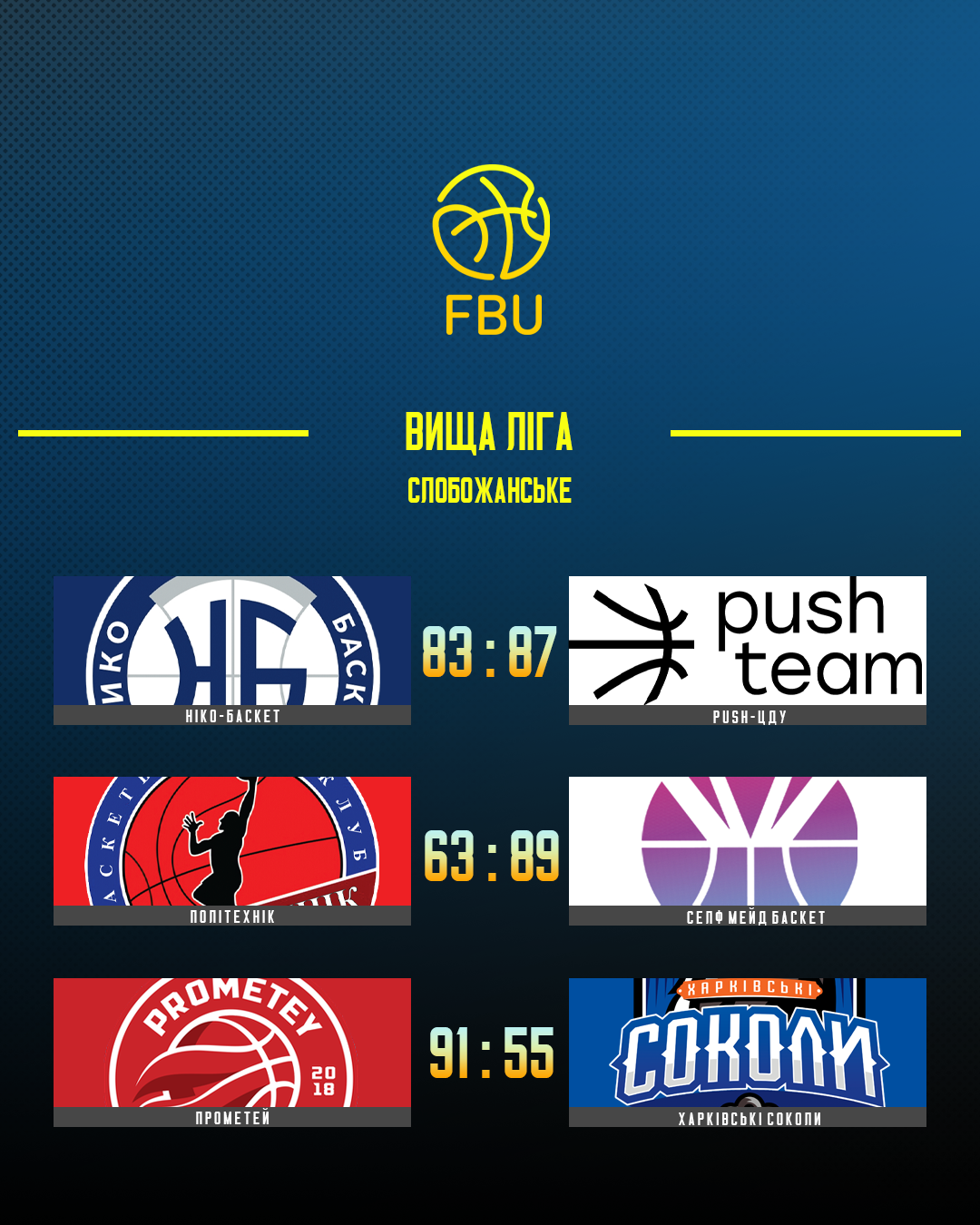 В Слобожанському продовжив свою переможну серію в Вищій лізі Прометей, який впевнено переміг Харківських Соколів (91:55). Інша харківська команда Політехнік також зазнала поразки, поступившись столичному Селф Мейду (63:89), а Push-ЦДУ достатньо неочікувано здолав Ніко-Баскет (87:83) завдяки перформансу 16-річного Романа Потєєва, який набрав в цьому матчі 33 очки.