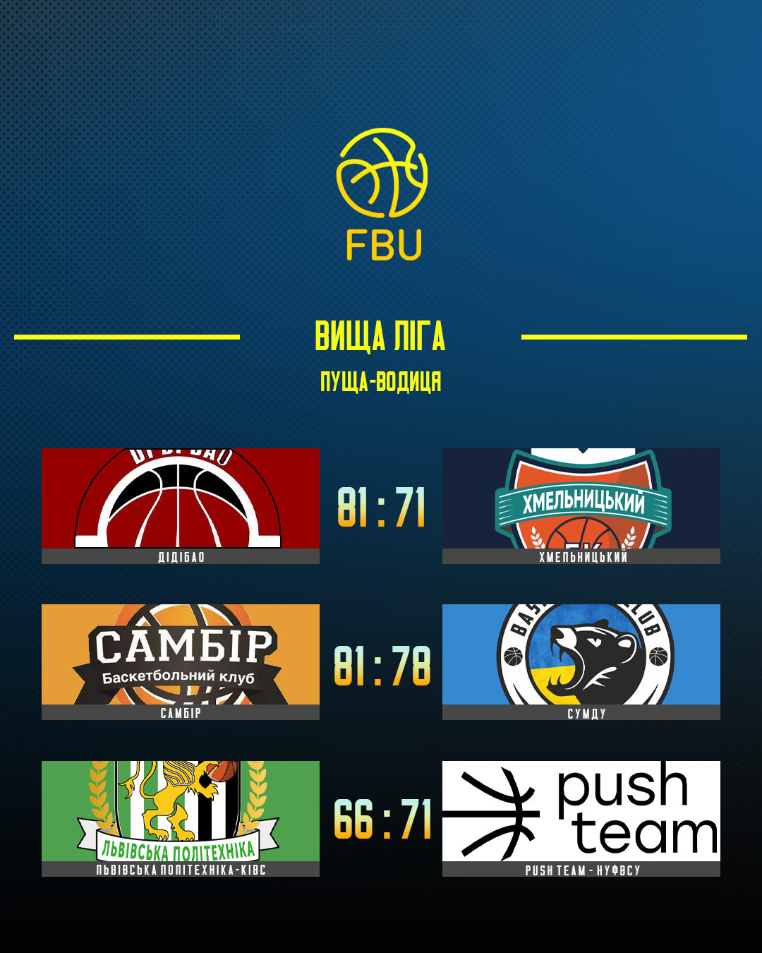 В Пущі-Водиці свою четверту перемогу в сезоні здобув ДіДіБао, який здолав одного з аутсайдерів чемпіонату Хмельницький (81:71). Самбір у напруженій грі здолав сумський СумДУ (81:71) та закріпився на другому місці в турнірній таблиці. А Push Team-НУФВСУ завдав 14 поразки поспіль Львівській Політехніці (71:66).