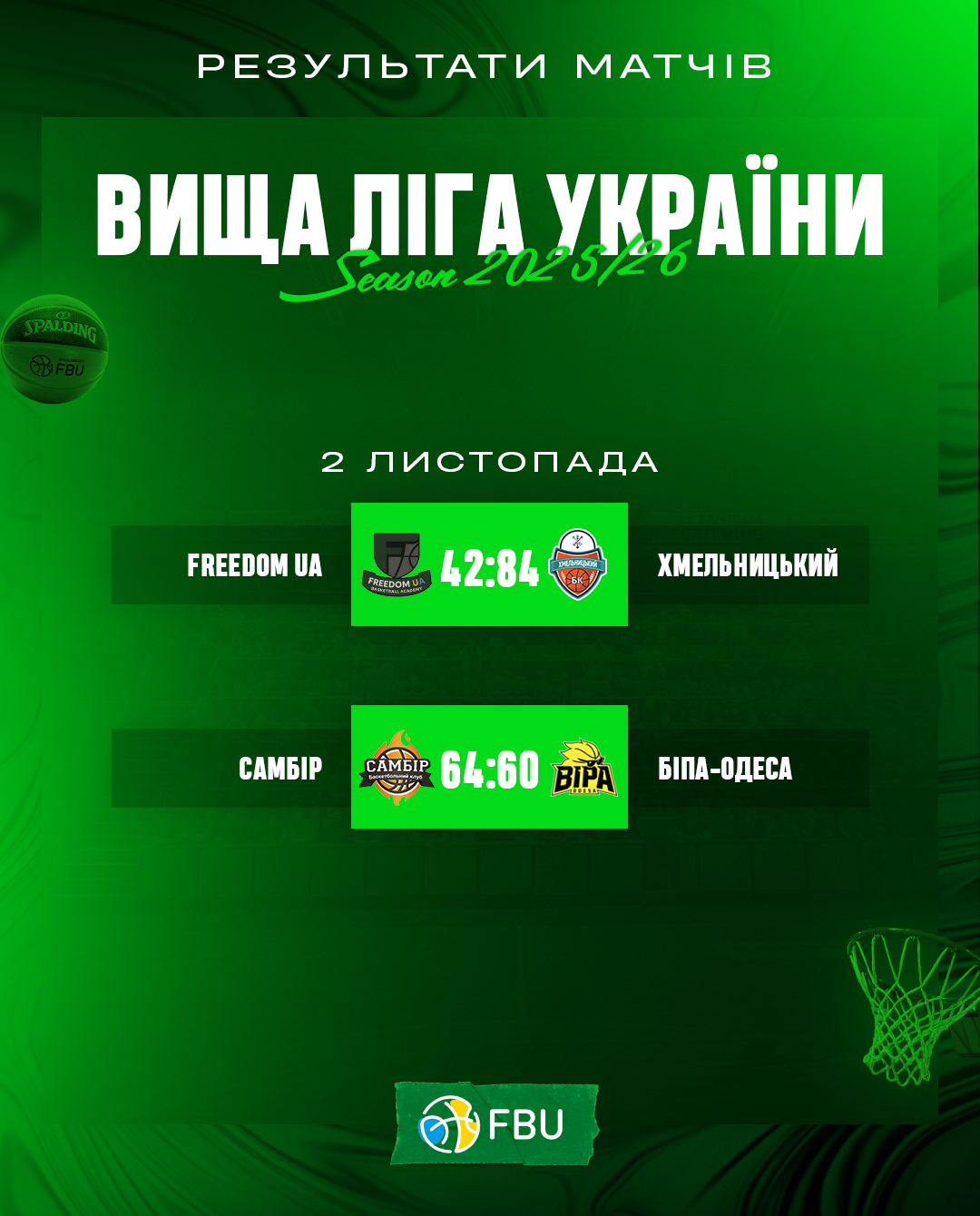 В неділю, 2 листопада, відбулися заключні матчі першого туру регулярного чемпіонату Вищої ліги. В столиці Freedom UA вдруге поспіль програв Хмельницькому (42:84). Гості отримали перевагу ще на старті матчу, вигравши першу чверть +13. В подальшому команда Ганни Шликової впевнено утримувала лідерство, яке протягом матчу сягало максимальних 43 очок. Найрезультативнішим гравцем матчу став Родіон Кузьмін, який набрав 19 очок.