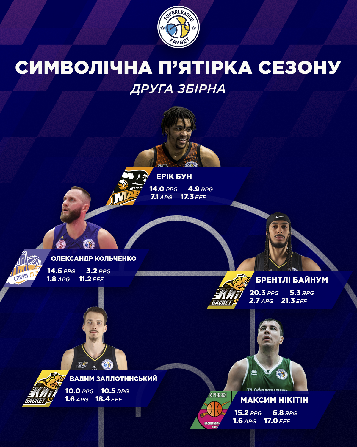 Вадим Заплотинський (Київ-Баскет, 33 матчі) — 10.0 очка, 10.5 підбирання, 1.6 передачі (РЕ 18.4)