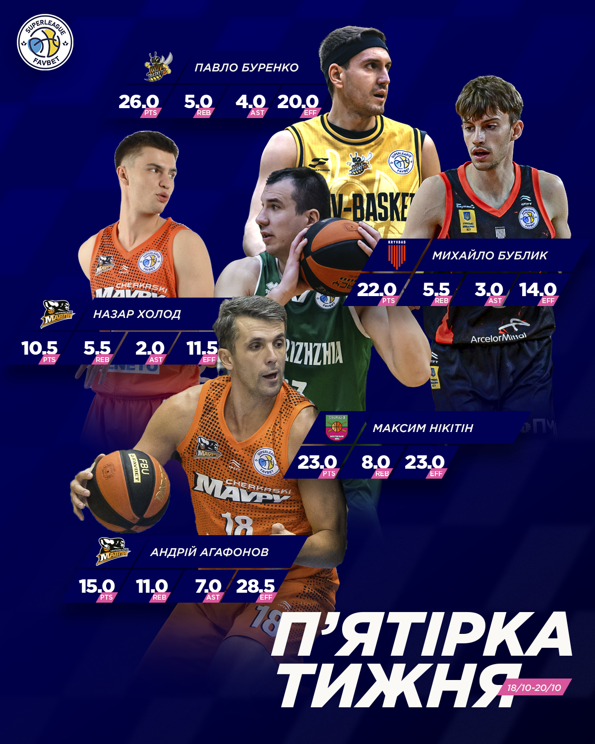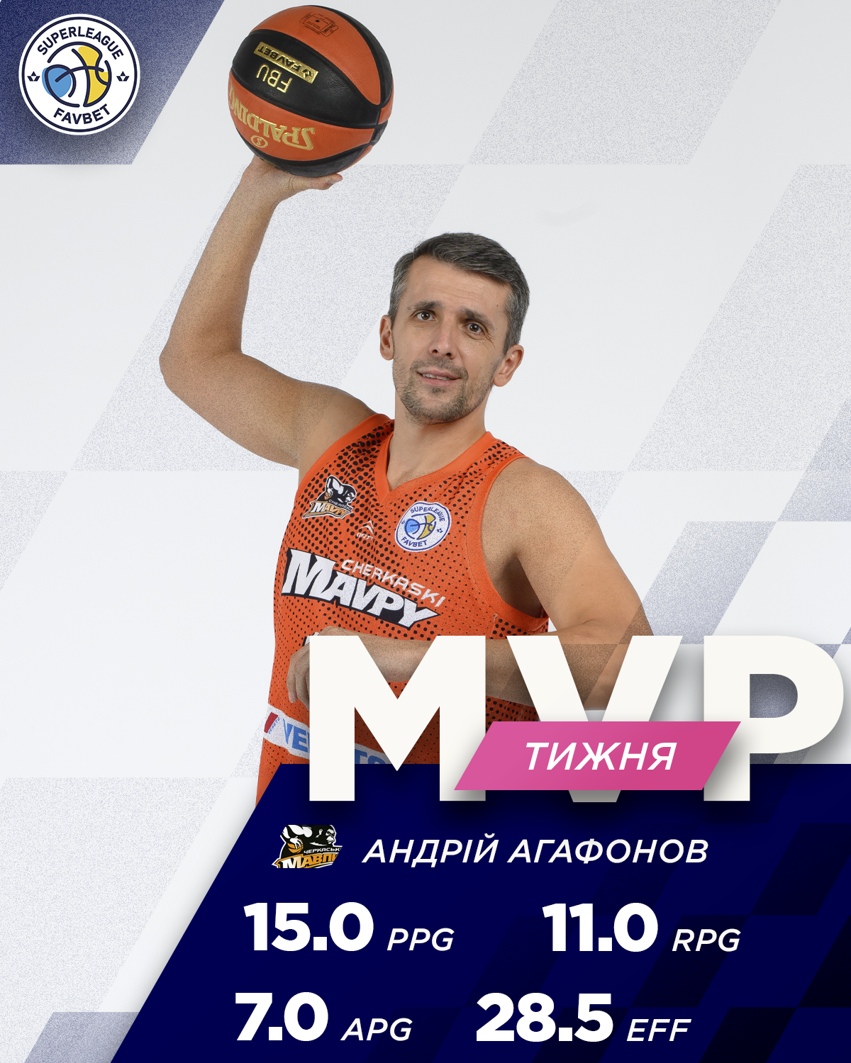MVP тижня визнано центрового Черкаських Мавп Андрія Агафонова. Бігмен продемонстрував лідерську гру в обох матчах вікенду, ставши головним героєм в зустрічах проти Рівного (14 очок, 12 підбирань, 6 передач, РЕ 27) та Старого Луцька (16 очок, 10 підбирань, 8 передач, РЕ 30). Універсальна та ефективна гра центрового черкасців допомогла його команді очолити турнірну таблицю Суперліги Favbet.