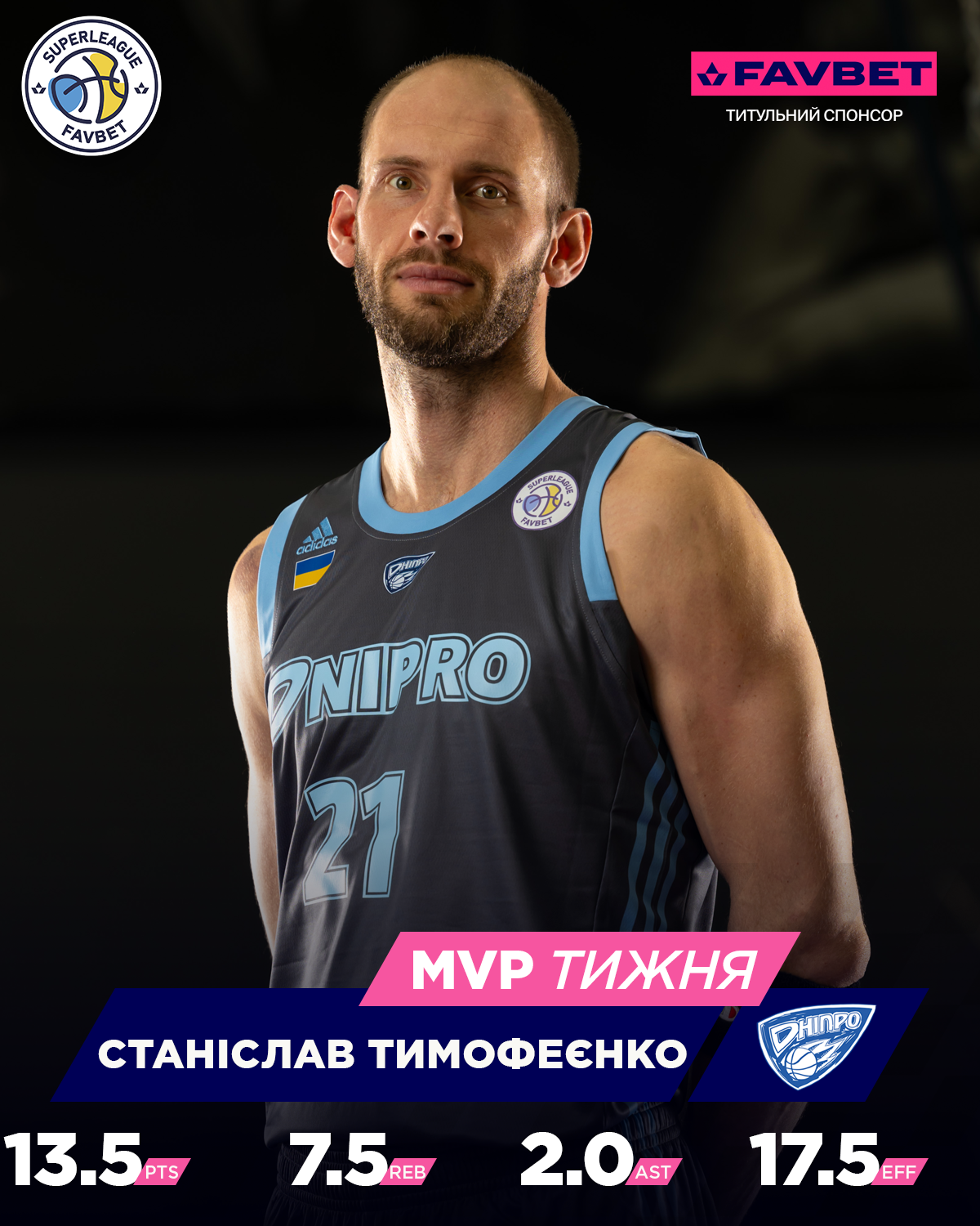 MVP ігрового тижня визнано форварда Дніпра Станіслава Тимофеєнка. Капітан чемпіонів України допоміг своїй команді здобути чергові перемоги в рамках регулярного чемпіонату та продовжити переможну серію дніпрян в сезоні 2024/25 до 8 матчів.