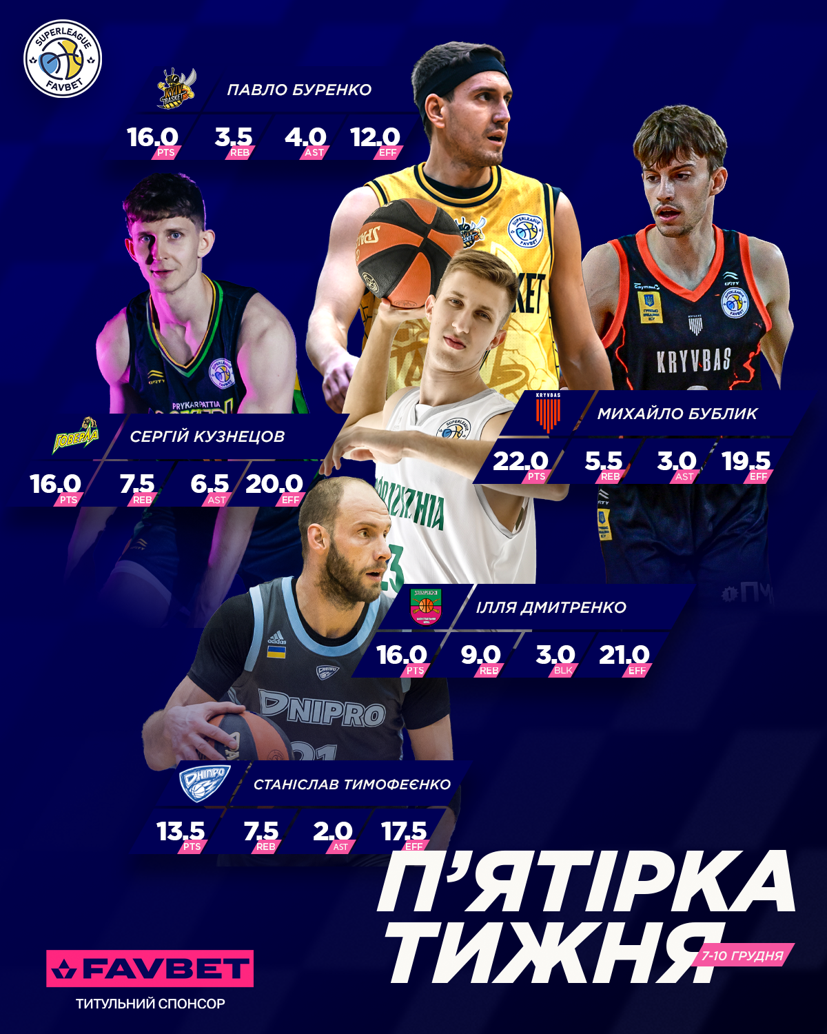 Павло Буренко (Київ-Баскет) — 16.0 очка, 4.0 передачі, 3.5 підбирання (РЕ 12.0)