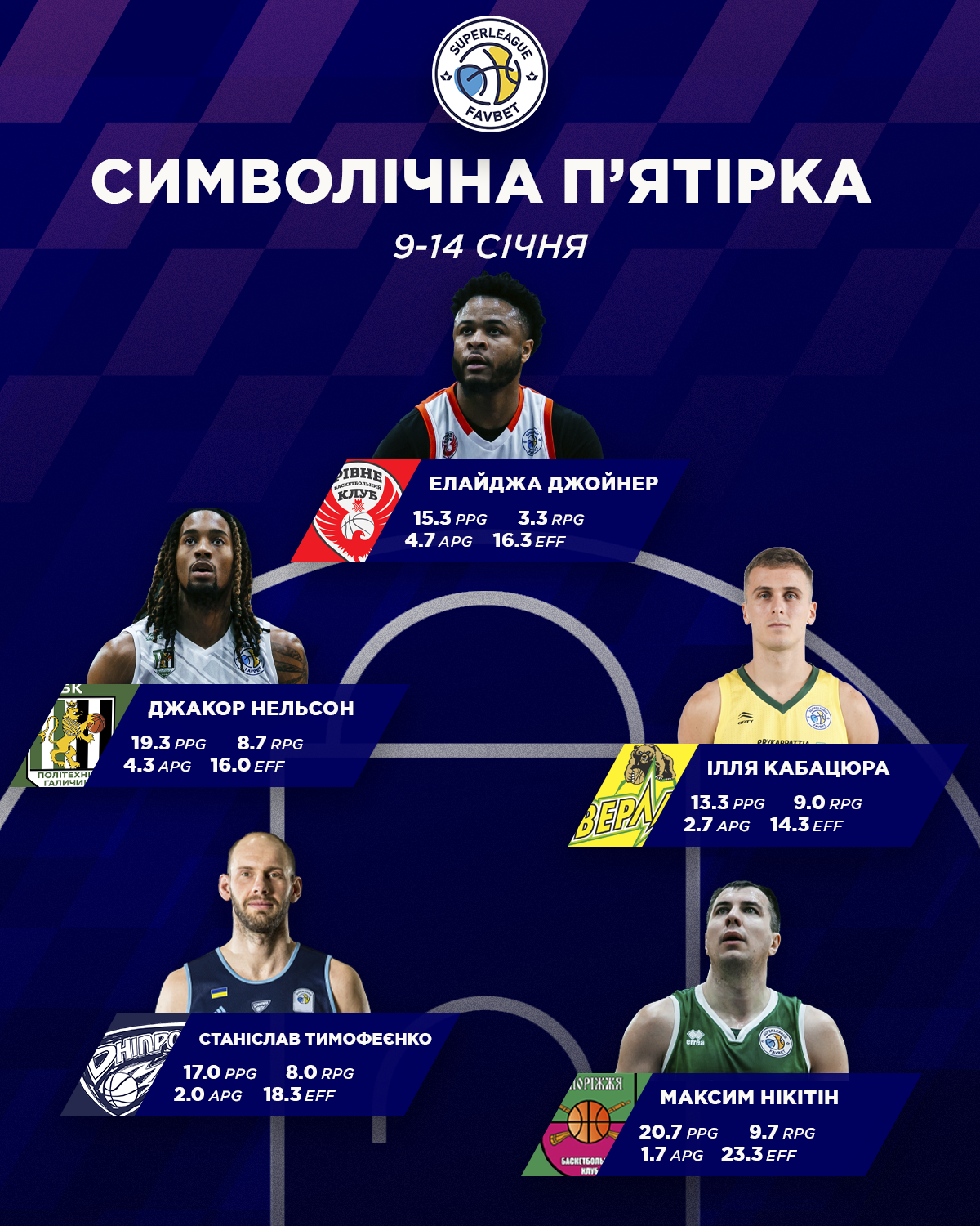 Джакор Нельсон (Політехніка-Галичина) — 19.3 очка, 8.7 підбирання, 4.3 передачі, 3.0 перехоплення (РЕ 16.0)