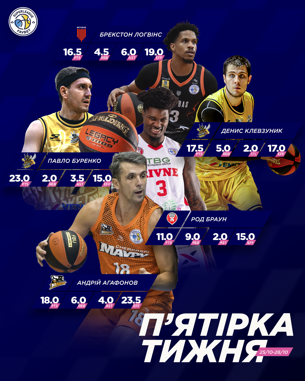 Павло Буренко (Київ-Баскет) — 23.0 очка, 3.5 передачі, 2.0 підбирання (РЕ 15.0)