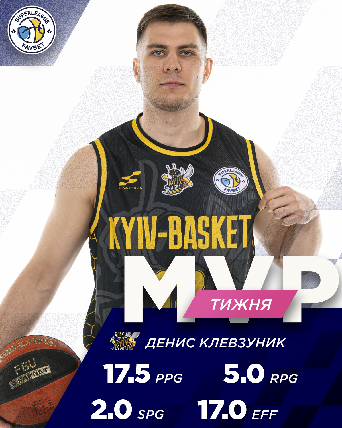 Денис Клевзуник (Київ-Баскет) — 17.5 очка, 5.0 підбирання, 2.0 перехоплення (РЕ 17.0)