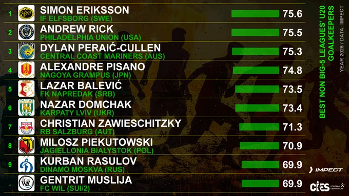 Міжнародний центр спортивних досліджень CIES Football Observatory оприлюднив рейтинг найкращих молодих голкіперів світу серед футболістів, народжених у 2006 році та пізніше, які виступають поза топ-5 ліг Європи.