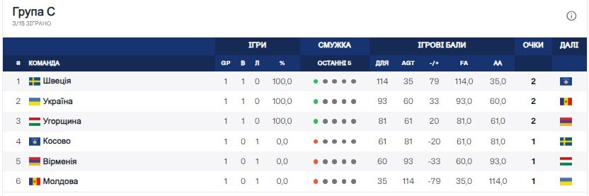 Після першого туру в групі С лідирує Швеція, другою йде Україна, а замикає трійку Угорщина.