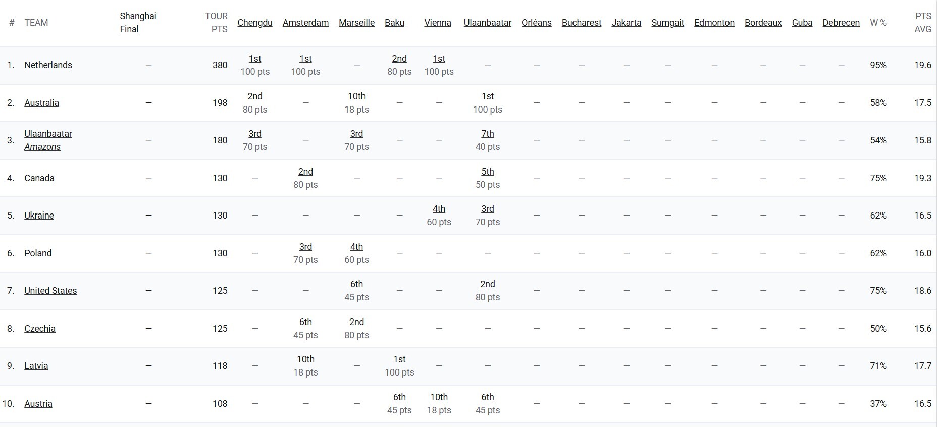 Лідирують Нідерланди, які зіграли на чотирьох етапах, вигравши три з них. Австралія, вигравши у Улан-Баторі, піднялась на друге місце.
