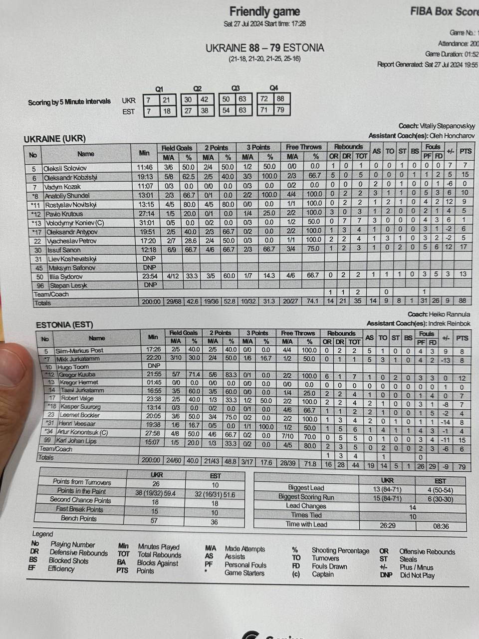 Відзначимо в цьому матчі лише 9 втрат українців та 10 реалізованих дальніх (у Естонії – 3), в тому числі 3/3 у Кобзистого, 2/2 у Шунделя та 2/3 у Санона. При цьому збірна Естонії виграла підбирання 44 на 35, а ще естонці виконували більше штрафних – на 12 більше.
